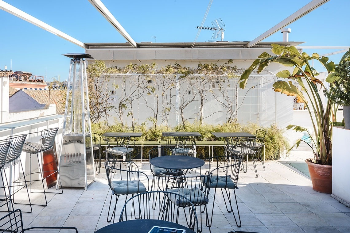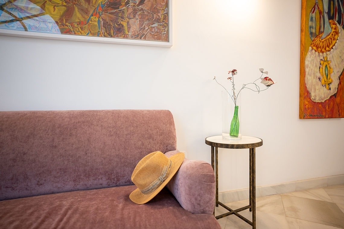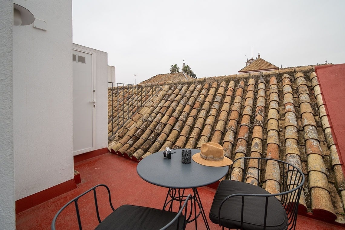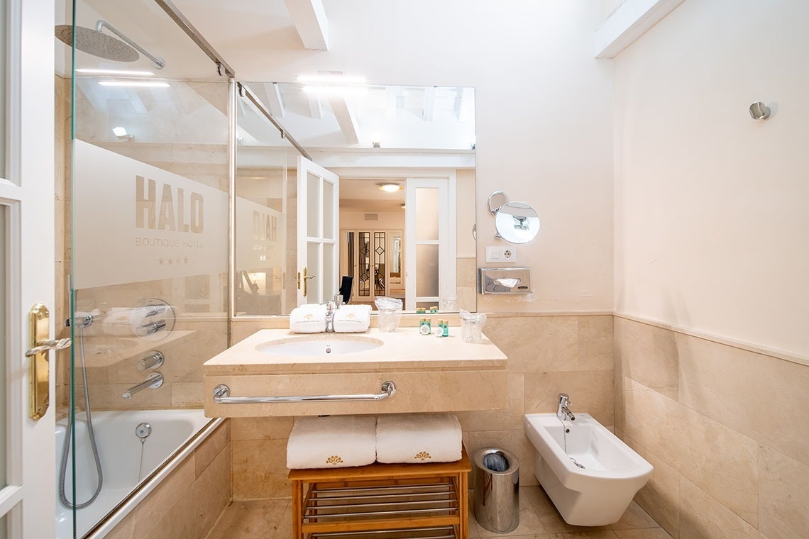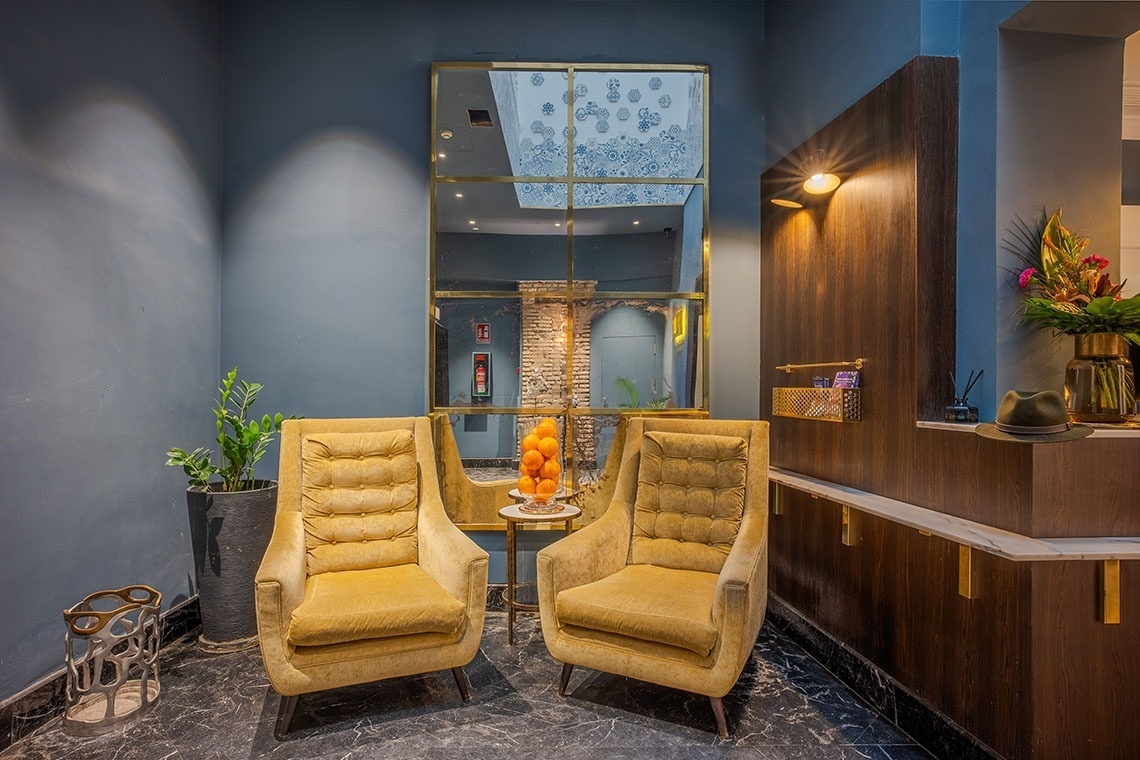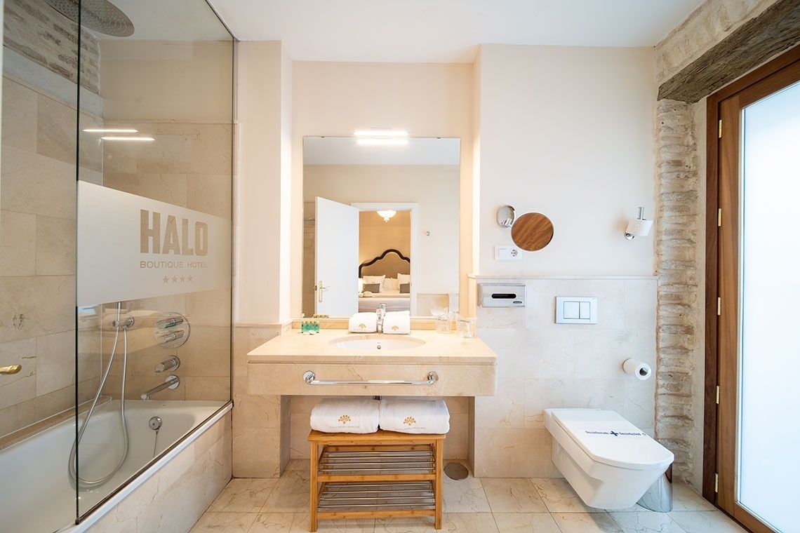 Junior Suite con patio privado y jardín vertical con ducha exterior. Dispone de una acogedora y luminosa zona de estar equipada con sofá. Cuarto de baño con bañera ducha de mano y gran rociador efecto lluvia. En la decoración predomina el estilo moderno, donde destacan los azulejos hexagonales italianos de diseño exclusivo. Los tonos claros junto con la tranquilidad de la habitación y el frescor del patio privado,generan un ambiente de relax ideal para descansar después de disfrutar de una visita por la ciudad de Sevilla.