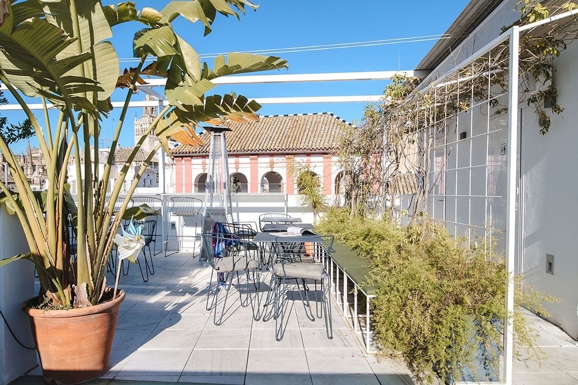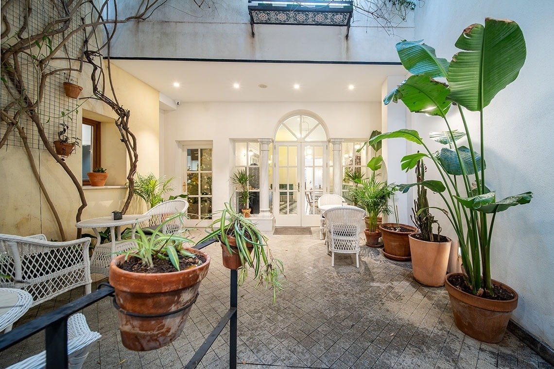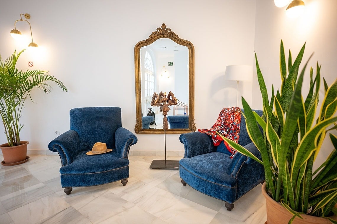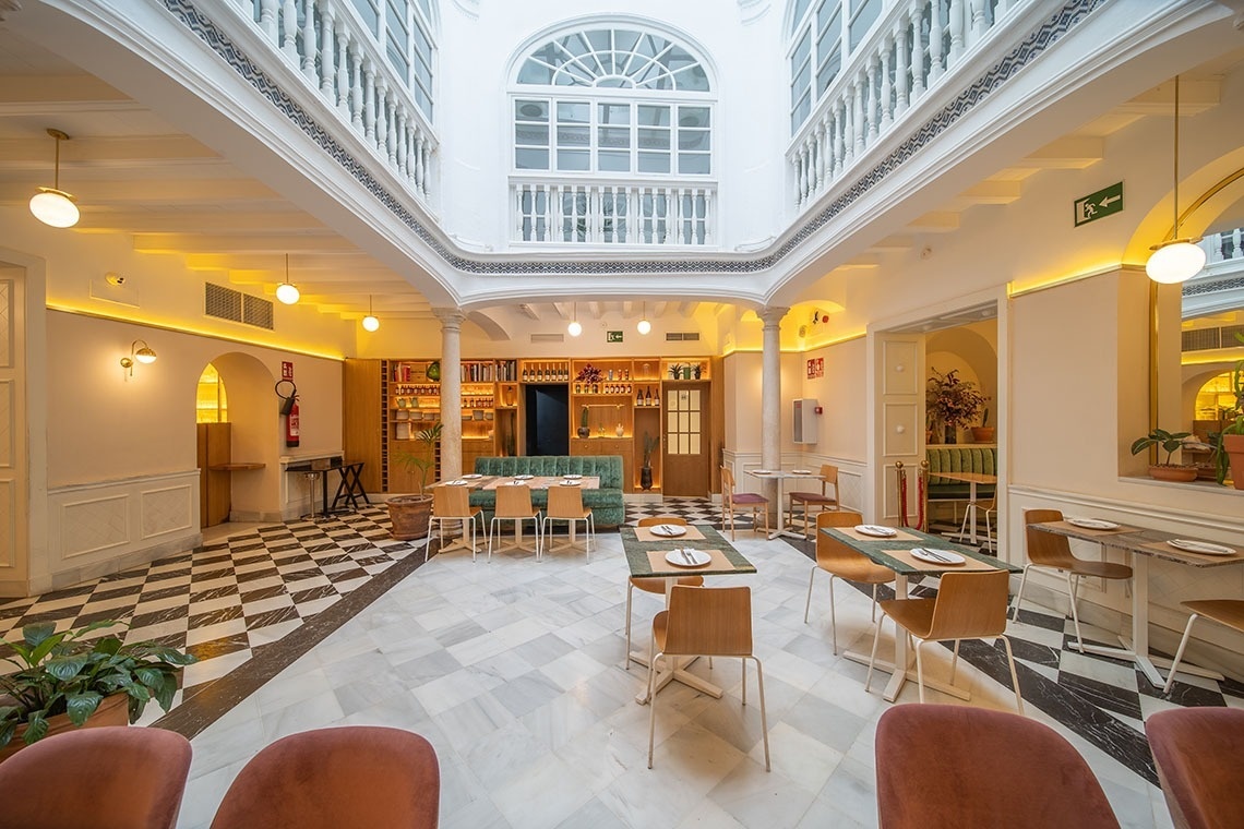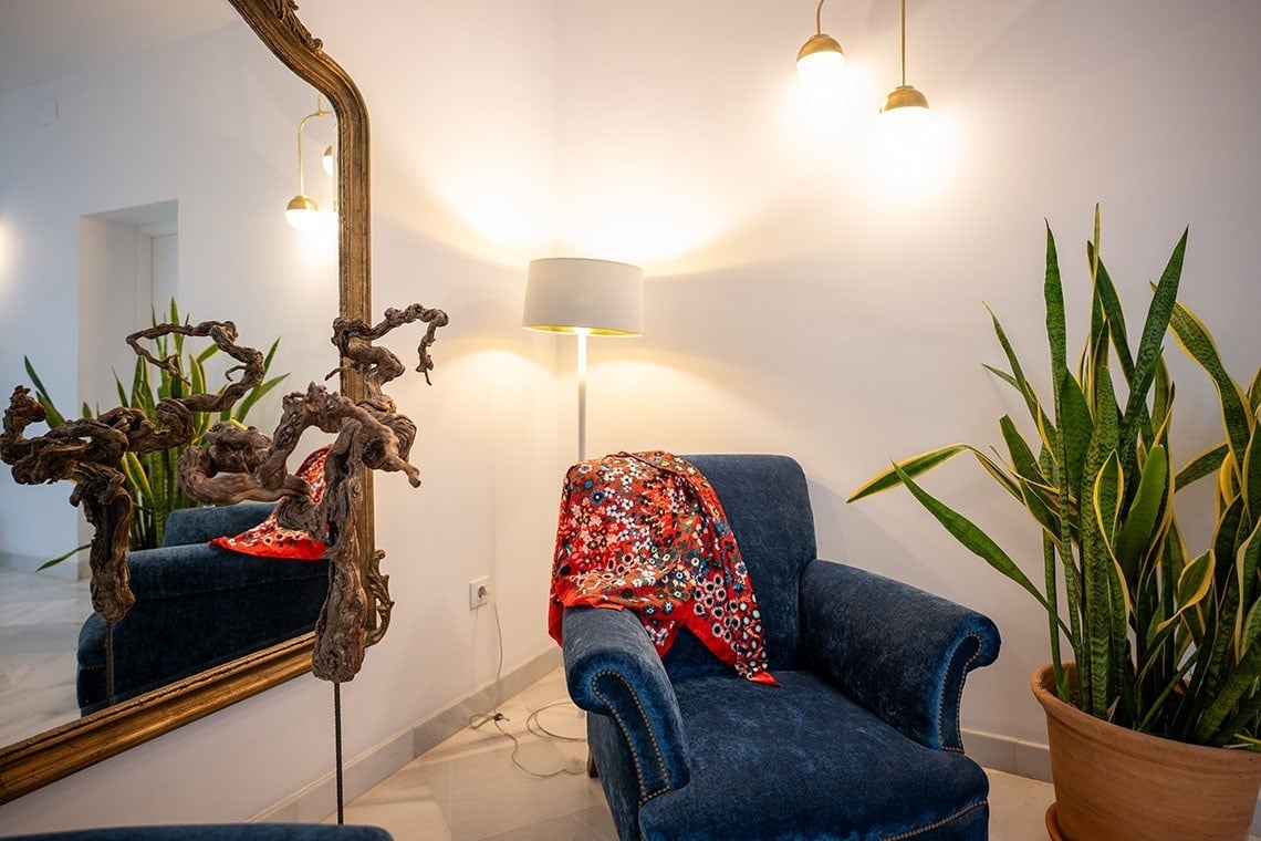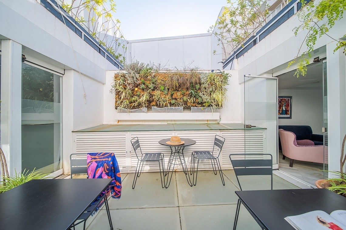 Junior Suite con patio privado y jardín vertical con ducha exterior. Dispone de una acogedora y luminosa zona de estar equipada con sofá. Cuarto de baño con bañera ducha de mano y gran rociador efecto lluvia. En la decoración predomina el estilo moderno, donde destacan los azulejos hexagonales italianos de diseño exclusivo. Los tonos claros junto con la tranquilidad de la habitación y el frescor del patio privado,generan un ambiente de relax ideal para descansar después de disfrutar de una visita por la ciudad de Sevilla.