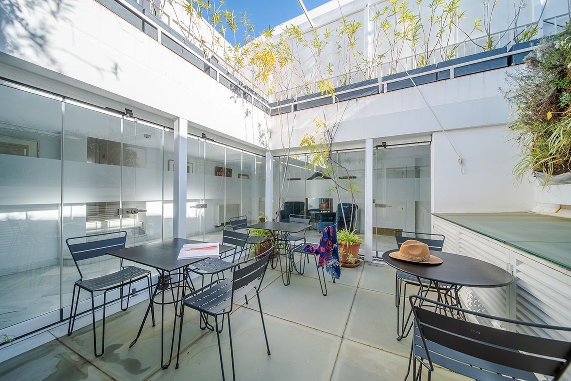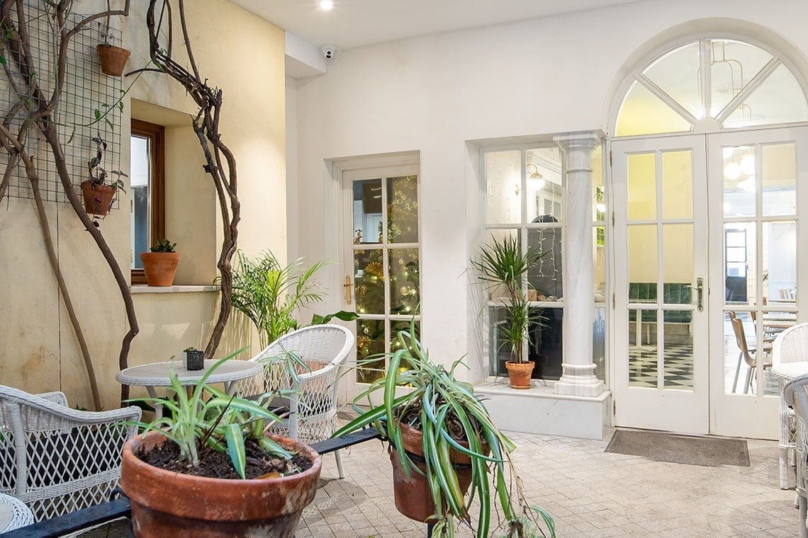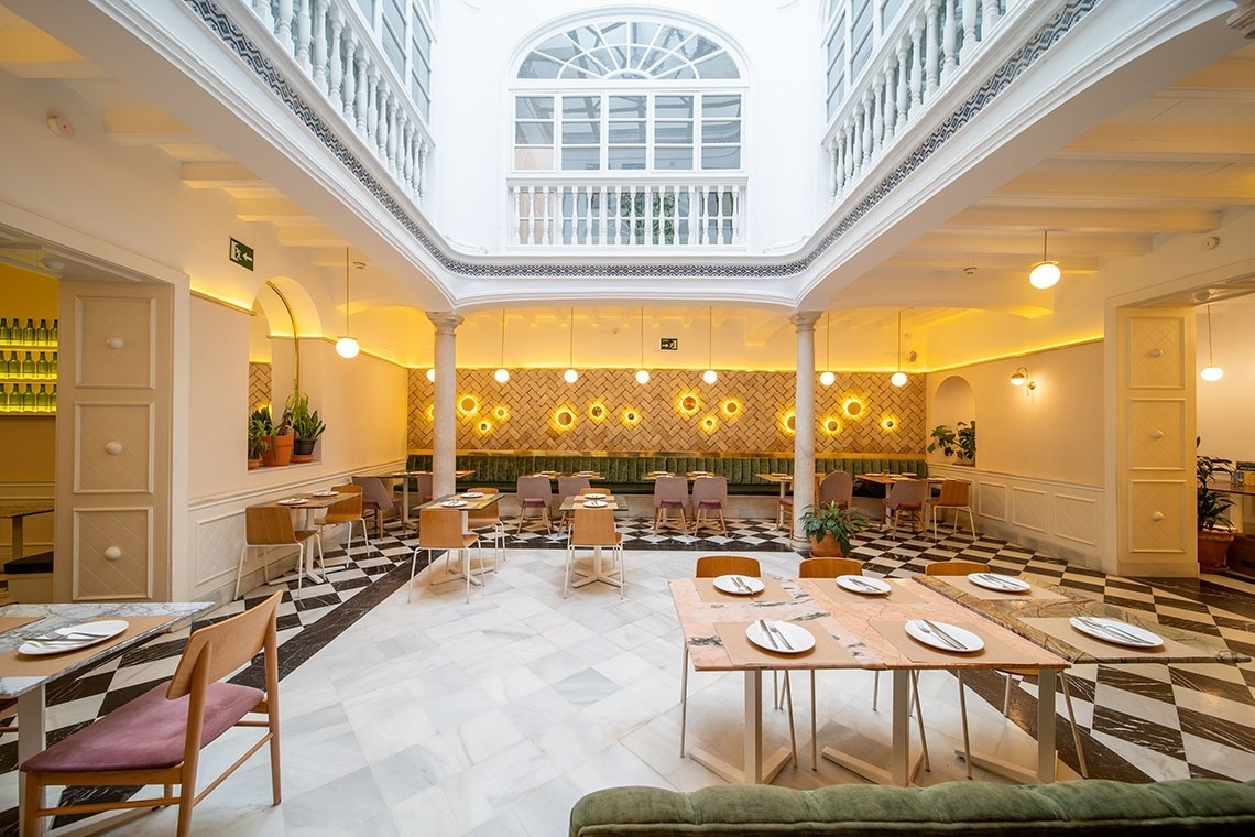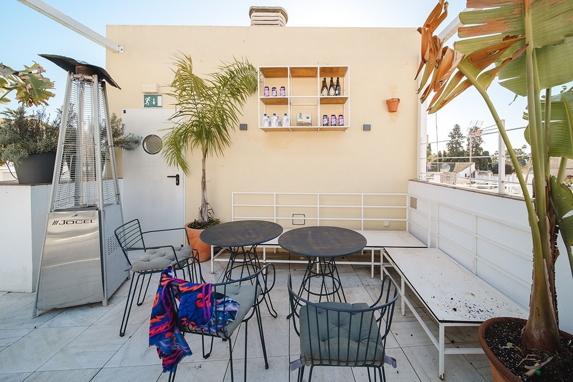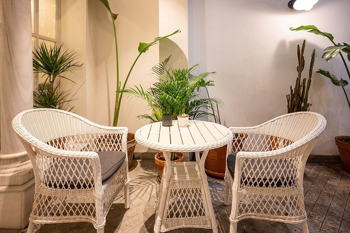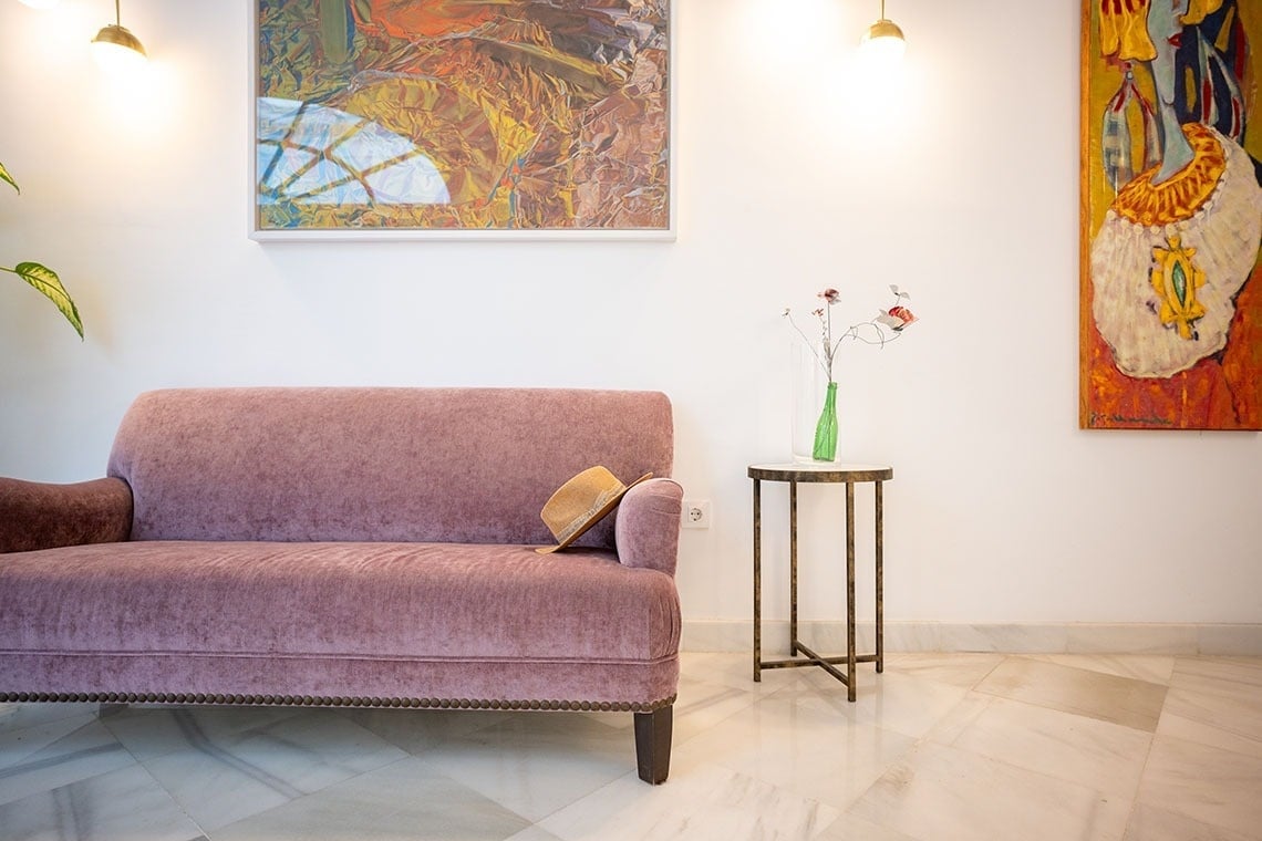 Junior Suite con patio privado y jardín vertical con ducha exterior. Dispone de una acogedora y luminosa zona de estar equipada con sofá. Cuarto de baño con bañera ducha de mano y gran rociador efecto lluvia. En la decoración predomina el estilo moderno, donde destacan los azulejos hexagonales italianos de diseño exclusivo. Los tonos claros junto con la tranquilidad de la habitación y el frescor del patio privado,generan un ambiente de relax ideal para descansar después de disfrutar de una visita por la ciudad de Sevilla.
